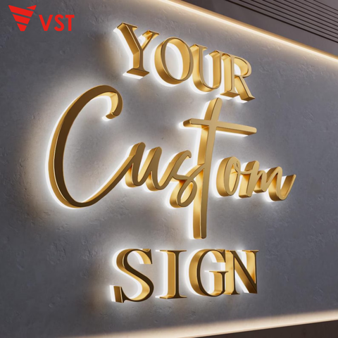 VST خارجي مقاوم للماء ثلاثي الأبعاد ذهبي معدني أكريليك شعار بإضاءة خلفية ليد حروف مخصصة لافتة للأعمال التجارية